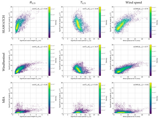 Scatter plots of the significant wave height (left), significant wave period (middle), and wind speed at 63 m (right) against the significant tilt angle for WAVEWATCH (top), WindSentinel (middle), and MIA (bottom). The values in the upper right of the plots are the correlation coefficients of the corresponding x and y.