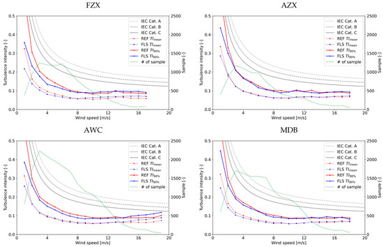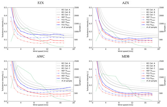 The performance of the FLS’s raw measurement for the turbulent component, without the use of a compensation algorithm, is analyzed with a comparison to a fixed VL. Figure 8 shows TImean and TI90% as a function of the wind speed for both the FLS and fixed VL. The normal turbulence models (NTMs), categories A to C, as per IEC61400-1 [18], are also shown in Figure 8 as references. The overall result suggests that the FLS tends to overestimate both TImean and TI90%. This trend is more notable for FZX and AWC than for AZX and MDB. It can easily be explained by comparing FLSs using the same LiDAR technology (FZX and AZX using a continuous-wave LiDAR and AWC and MDB using a pulsed LiDAR). If the same LiDAR technology is used, the FLS with a larger motion has a larger error in the turbulence measurement. Regarding the two measurements for AZX and AWC, which are installed on the same buoy and accordingly affected by the same motion, the pulsed-LiDAR may have a larger error. Finally, the differences between TImean and TI90% for both fixed VL and FLSs are similar, which suggests that the standard deviation of the standard deviation in each wind speed bin () is relatively well captured, even by FLSs; however, the mean standard deviation () is not well captured. Therefore, a correction for a systematic bias in TI is important for a better representation of both TImean and TI90% by the FLS.