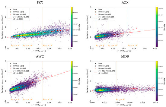 As suggested in the previous section, the error in standard deviation and TI is dependent on the buoy’s motion. To better understand this, a sensitivity assessment of the error to the buoy’s motions is qualitatively and quantitatively carried out. Figure 9 shows the relationship between the extent of motion in the x-axis and error in the standard deviation in the y-axis for wind speeds higher than 2 m/s. As previously mentioned in Section 2.7, the x-axis uses instead of , because we found a clearer linear trend with this parameter. The range of the x-axis is 0 to 0.06 for FZX, AZX, and AWC and 0 to 0.01 for the MDB due to the smaller motion. To evaluate the systematic error, bin-averaged plots are also shown. Furthermore, the validity of the binned statistics is evaluated based on the number of samples, in accordance with the classification study in the IEC standard [19]. A linear regression is obtained for the valid bins that contain sufficient samples.