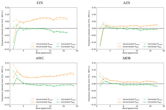 With the slope and offset obtained from the regression analysis in the previous section, the proposed correction method is applied to each FLS dataset in accordance with Equations (5) and (6). Figure 10 shows the resultant TI based on the corrected standard deviation of wind speed. Figure 11 shows the FLS TI estimation errors against the fixed VL before and after the correction is applied. Overall, these figures show a huge improvement in the FLS-measured TImean and TI90% for all FLSs through the correction approach. Regarding the trend of the corrected TI, it may tend to be underestimated, i.e., overcorrected for a low wind speed, and vice versa for a high wind speed. The trend is observed for FZX and AWC. However, a large portion of the overestimation of TI by FLS is corrected by this approach. This implies that the motion of the FLS significantly contributes to the overestimated TI. Therefore, the assessment proves the benefit of the correction based on the single statistic parameter , which represents the intensity of the buoy motion.