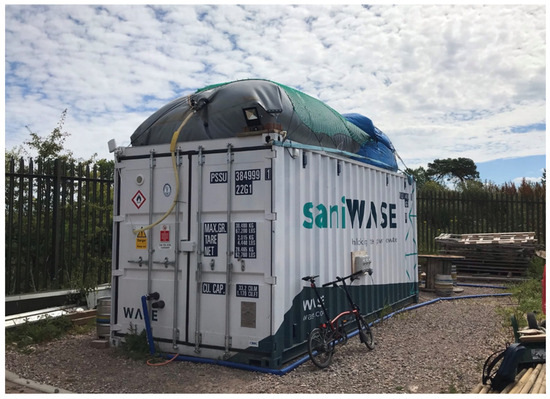 Over the entire trial, approximately 456,000 L of biogas was produced, resulting in 320,000 L of methane. This resulted in a total energy recovery of 3.3 MWh. During the period of peak stable HRT (2.3 days) and OLR, an average of yield of 0.43 ± 0.16 CH4/kg COD removed was achieved, equating to 39 kWh/m3 WW per day recovered in the primary vessel alone. The energy cost of powering the electrodes was 19.5 kWh, equating to 0.59% of the total energy recovered. This parasitic energy draw was insignificant compared to the benefits afforded by the improved performance of the system in terms of operability and stability improvements. The total energetic cost of running the trial was approximately 3.7 MWh, so the trial system was not energy positive. The system was not optimised for energy efficiency, and heating was the main cost. In order to ensure strict safety standards for the prevention of explosive environments, the air inside the trial system was constantly extracted, increasing the duty cycle and power required to heat the influent waste, which was at ambient environmental temperature. Heating jackets were placed around the outside of the IBC containers, which meant that approximately 40% of the thermal energy was dissipated, heating the air inside the container rather than the vessel. To heat a 400 L volume of water from 15 °C to 35 °C over a day, it would take 9.3 kWh of energy. In the trial system, approximately double that value was used. By improving the efficiency of the heating system alone, energy positivity could be achieved. With a jacket with a heating power of 600 W, the system can maintain a constant temperature at a HRT of 2.3 days (400 L per day) if it is 65% efficient. If the heating system was 95% efficient, a heating power of approximately 400 W would be required. In a commercial system, the whole volume of the shipping container or chosen vessel may be occupied by liquid, so no heat loss can occur due to extracted air. This will significantly improve the energy efficiency of the system. Effluent heat recovery could also allow for preheating of influent waste. As warm, treated wastewater leaves the system, it is passed through a heat exchanger to warm the fresh wastewater, recovering thermal energy. This could increase the influent temperature by approximately 10 °C, further halving the energy requirement for heating to 4.7 kWh, meaning a heating power of 200 W is required to maintain 35 °C in the trial system. Further work will be carried out in order to improve the energy efficiency of the heating system in later trials, demonstrating energy-positive operation.