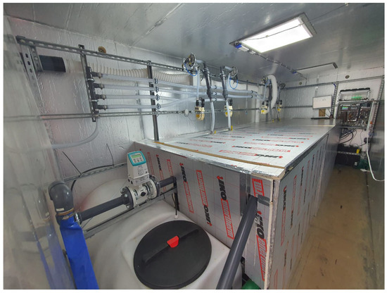 Internal view of the trial system. Visible from left to right, EQ tank and liquid flowmeter, gas handling system, insulation boards covering the four IBC reactors and pipework, remote operating, and control systems [15].