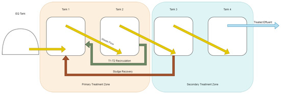Wastewater was pumped on a timer-based system from the Hepworth wastewater holding vessel to the internal equalisation tank of the test system. Additives such as trace elements and ferric hydroxide were dosed at this point. Wastewater was then pumped from the internal equalisation tank into a distribution manifold in the bottom of the T1 ((Tank 1) primary reactor) at a determined feeding rate. As wastewater was added, digestate flowed from the top of each reactor over a gravity weir to the bottom of the next reactor in a cascade, allowing for the decoupling of hydraulic and solid retention time and facilitating control of the position of active biomass in the reactor. Sludge recirculation was carried out with a peristaltic pump (AMP-16D, Boyser Pumps, Barcelona, Spain) from the bottom of each vessel to simulate the recovery of solids from a settlement step that would form part of a commercial system and to hold biomass in the primary treatment vessel of the system. The block flow diagrams for this operation are available in Figure 3 and Figure 4. This sludge recirculation enabled the use of a high flowrate (low HRT) operation without washing out settleable biomass. The produced biogas was held in two bags, measuring 6 m3 and 4 m3, on top of the shipping container, which facilitated the storage and flaring of excess biogas to a water heater or stove. Mixing was provided by gas recirculation from the headspace, bubbled through four lances placed at the bottom of the reactors. A gas pump with a flowrate of approximately 35 L/min was utilised and operated in synchronicity with feeding schedules. The gas mixing would operate for only 5 min after every feeding event, allowing for settlement in order to reduce washout before the next feeding event. As the reactor is a sequential design consisting of four vessels, the OLR of the system would be based on the primary treatment zone. With the acidic and rapidly degradable brewery wastewater, sequential or series treatment is not required to improve hydrolysis, as noted in some studies [17,18]. Initially, the primary treatment zone was classified as the first two of the 4 tanks (Figure 3). This was intended to prevent pickling and inhibition of the anaerobic digestion process that would be caused by the first vessel experiencing the organic load that a continuous stirred tank reactor (CSTR) four times its size would experience. This separation of treatment zones was created by recirculating waste between the two vessels at at intervals of 5 min on, 5 min off at a flowrate of approximately 50 L/min (reduced from 239 L/min rated flow of the centrifugal pump). This resulted in 36 m3 of flow per day, or 20 full recirculations of the two tanks per day. This method was discontinued after the first phase of the experiment. Sludge recovery (second-phase recirculation) was performed for 15% of each day. This resulted in 200 L of sludge from the 1st tank in the secondary phase (T3 initially, then from T2 in the later phase visible in Figure 4) being recirculated to T1 per day.