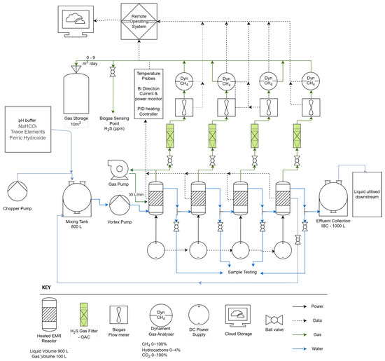 Often, electroactive methanogenic species capable of direct interspecies electron transfer (DIET) are found at the anode in high relative abundance, directly utilising metabolites from the hydrolysis and acetogenic phases of anaerobic digestion without the need for the cathode [5]. A cathode potential of between −0.4 and −1.3 V (relative to a standard hydrogen electrode (SHE)) is applied to surpass the minimum hydrogen evolution potential of −0.4 V and encourage the selection of appropriate microbial communities. Because of the protective environment of the electrode biofilm, the microbial biomass responsible for waste treatment and biogas production is protected from stresses such as low waste pH, low hydraulic retention time (HRT)-related washout, and variable waste quality that would normally inhibit AD systems and reduce their treatment performance. EMRs offer performance benefits, with research demonstrating increased operational stability and 1.7 times higher energy production through increased gas yields and higher methane concentration than in AD [6,7].