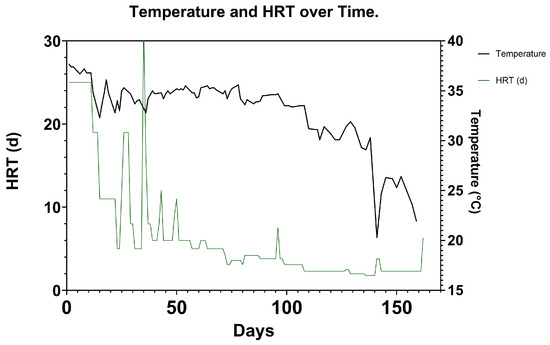 Temperature of the primary treatment zone over the course of the experimentation displayed with OLR. This shows how temperature decreased over time as the environmental temperature lowered, and OLR was increased by decreasing HRT. The periods of peak HRT occurred while temperatures were on average 30 °C and 25 °C.