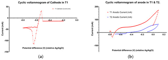 Cyclic voltammograms: (a) cathode in T1 [15], (b) anodes in T1 and T2, all relative to Ag/AgCl.