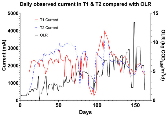 Graph comparing the trends in tank daily average current in T1 and T2 compared to OLR. Initially, T2 exhibits the highest current, but as OLR increased and the experiment went on, T1 exhibited higher average daily power. Significant reductions in reactor current around day 90 and day 145 are associated with reductions in OLR due to pump failures and maintenance.