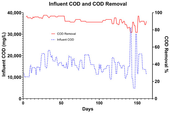 Graph showing the relationship of influent COD (mg/L) and COD removal percentage. Despite large variations in influent COD, average COD removal in the primary reactor was 88% (ranging from 95% to 77%).