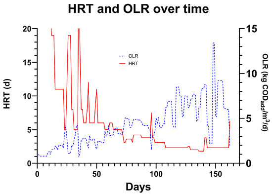 Over the course of the trial, the HRT was reduced from 16 days to 2.3 days with stable operation and a 12-day period operating between 2.3 and 1.8 days (days 129–140). Over the 12 days, the average HRT was 1.9 days, and the OLR was 7.23 kgCOD/m3/day (Figure 13). FOS/TAC increased from 0.4 to 0.8 over this period due to VFA accumulation from 971 mg/L to 1751 mg/L. This increase could be due to a number of reasons, which could be mitigated in further experimentation. For example, the temperature during this period averaged 31.3 °C, which is lower than the overall average of 34.1 °C, reducing the rate at which methanogens can utilise VFAs for methane production. It is reasonable to suggest that stability may have been possible if the temperature had been maintained. Some evidence for washout was observed as the SS captured from the top port of T1 decreased when compared to the period of 2.3 d of retention time prior, from 192 mL/L to 135 mL/L, indicating a lower amount of solids in the vessel. This was confirmed by a decrease in the SS being captured in the bottom of T2, decreasing from 443 mL/L to 263 mL/L. With a better biosolid settlement system such as a lamellar settler, or optimisations to process controls such as biogas mixing rates and sludge recirculation rates, it may be possible to achieve stable operation at 1.9 d HRT or below. In Figure 13, the relationship between OLR and hydraulic retention time can be observed. The OLR is seen to gradually increase from 0.6 to 6 kgCOD/m3/day by the end of the experimental period, with peaks as high as 13.4 being observed for 2 days. The average OLR over the two 19-day periods of stable operation at 2.3d HRT (days 108 to 126 and 143 to 162) were 6.6 and 6.7 kgCOD/m3/day, respectively. Comparing this to the next largest trial conducted by Cusick et al. [14], this is at least 4× higher than the stable OLR range of 0.76 kg sCOD/m3/day when allowing for the typical ratio of 2:1 tCOD to sCOD found in this study. Several more recent studies have been published at pilot scales, but none have been larger than 1000 L or have focused on producing methane as opposed to hydrogen [28,29,30]. This focus on hydrogen has reduced the impact of the reactors due to reduced energy positivity and effluent quality due to the need to inhibit and protect the cells from becoming methanogenic. Furthermore, ref. [14] was the only pilot-scale study to examine treatment wastewater from the food and beverage industry at scale, with most others focusing on low strength domestic wastewater (up to 4.3 g/L COD) with comparatively low energetic content. The influent in the [14] trial was diluted to keep it in the 0.7–2 g/L sCOD range, which is much lower than that used in the Hepworth trial system (8–30 g/L tCOD). This meant that the average stable OLR of the [14] system was between 0.7 and 2 kg sCOD/m3 reactor volume/d, which could be between 2 and 6× lower than the maximum stable OLR observed in this study (approx. 6.75 kg tCOD/m3/d) depending on the sCOD/tCOD ratio.