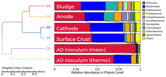Plot showing the relative abundance at the Phylum level of microorganisms in each sample. The weighted unifrac distance shows how samples D1–D4 are more similar compared to the inoculum sources of D5 and D6, suggesting that significant changes in microbial consortia have occurred in the pilot system over the trial [15].