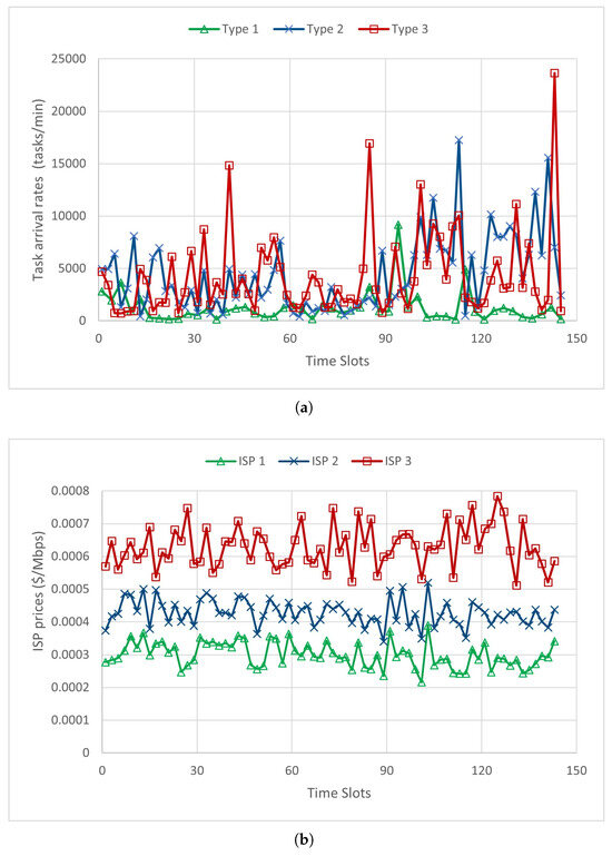 Here, K, N, and C represent the number of available ISPs, application types, and GDCs, respectively. The ISP bandwidth price at time slot is denoted by , while defines the arrival rate of application n’s tasks delivered via ISP k to GDC c at time slot . Additionally, represents the average task size for application n and L denotes the duration of each time slot (5 min).