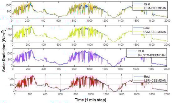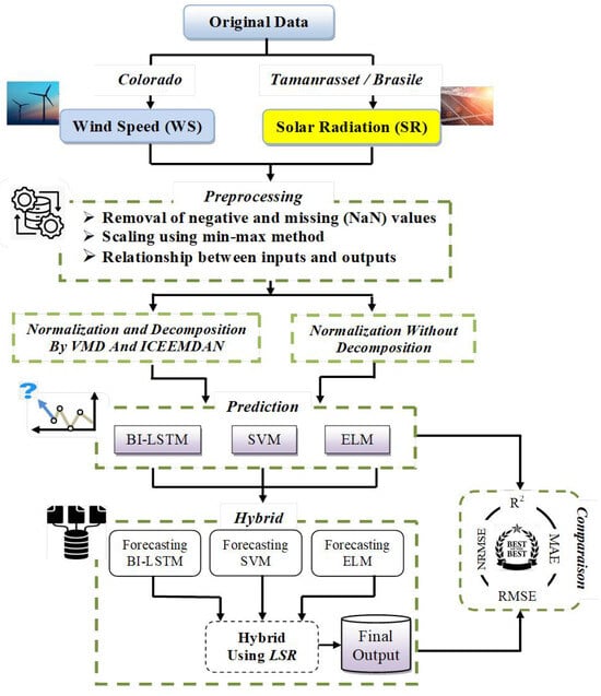 The proposed forecasting framework follows a sequential and modular architecture designed to enhance both accuracy and interpretability. The process begins with the input of raw time series data, such as global horizontal irradiance (GHI) or wind speed (WS), collected from real-world sensors. These input signals are often non-stationary and contain noise or redundant patterns, which can negatively impact model performance. To address this, a one-stage signal decomposition phase is applied using either variational mode decomposition (VMD) or improved complete ensemble empirical mode decomposition with adaptive noise (ICEEMDAN). This step separates the original signal into several intrinsic mode functions (IMFs), each capturing distinct frequency components, thereby improving data structure and reducing noise. Following decomposition, a sample entropy (SE)-based selection step is introduced. The SE value of each sub-signal is computed, and only those components with higher entropy—indicating greater informational content and reduced redundancy—are retained. This allows for dimensionality reduction and prevents low-informative or noisy sub-signals from being passed to the prediction models. The selected components are then processed in parallel by three different predictive models: Bidirectional Long Short-Term Memory (Bi-LSTM), extreme learning machine (ELM), and support vector regression (SVR). Each model is tailored to capture specific patterns within the data—Bi-LSTM models temporal dependencies, ELM provides high-speed learning, and SVR captures nonlinear relationships. Finally, the outputs of these models are integrated through a hybrid fusion strategy based on least-squares regression (LSR). The LSR model assigns optimal weights to the individual predictions, producing a single, unified output that leverages the strengths of each model while mitigating their individual weaknesses. This final prediction represents the most accurate and stable estimate of the target variable.