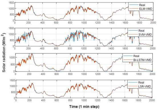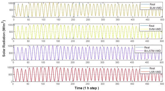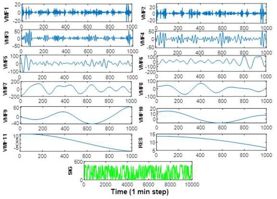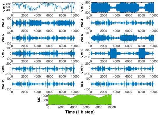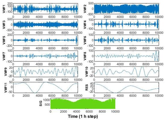 VMD is applied to forecasting global solar radiation and wind speed by splitting the signal into a set of distinct modes, including a final residual. This decomposition process enables the isolation of different frequency components, simplifying the identification of patterns useful for prediction [59,60,62]. Due to its ability to effectively handle the non-stationary characteristics of time series, VMD is particularly well suited for forecasting phenomena that exhibit temporal variability. Its application reduces the influence of noise and chaotic fluctuations, improving the precision and reliability of predictive models. The optimized frequency separation and uniform distribution of modes make VMD a fundamental tool for analyzing and forecasting complex energy-related data, such as those associated with solar and wind energy production [59,60,62].