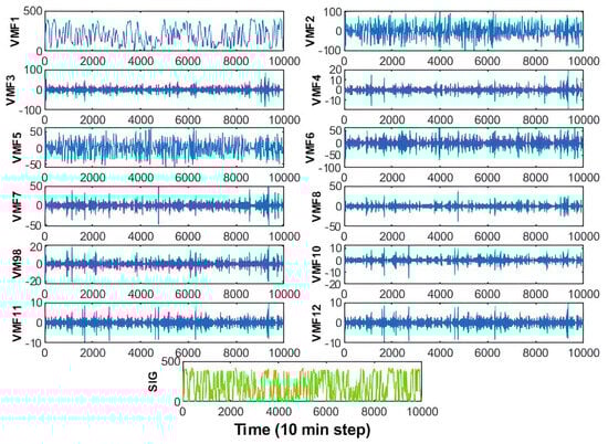 To achieve effective decomposition, VMD incorporates a bandwidth constraint that regulates the frequency distribution among the extracted modes [59,60,62]. This parameter prevents undesirable overlaps and ensures the clear separation of the information within the signal. Another key element is the Lagrangian stop multiplier, a parameter that influences the stopping criterion of the iterative process [59,60,62]. This value is determined by a regulation factor governing the decomposition’s convergence. In some configurations, VMD can be set up to avoid applying additional penalties on the deviation of modes during iterations, allowing the model to naturally adapt to the signal’s structure without artificial convergence constraints [59,60,62].