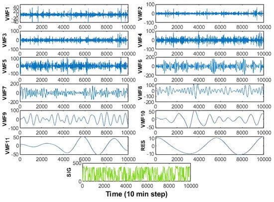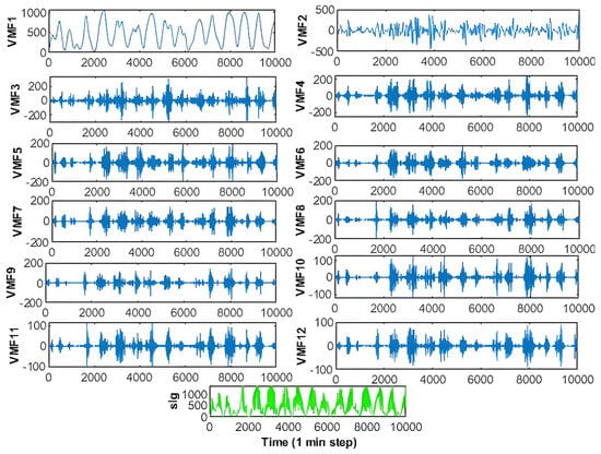 VMD is an advanced technique that decomposes a complex signal into subcomponents with specific frequency bands, optimizing them simultaneously to ensure stable and precise separation [59]. This method, particularly effective for nonlinear and non-stationary signals, reduces mode mixing and enhances data quality in forecasting models. It finds application in various domains, such as signal processing and renewable energy forecasting [60].