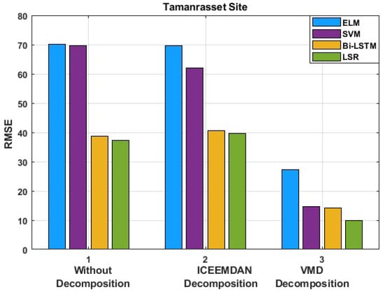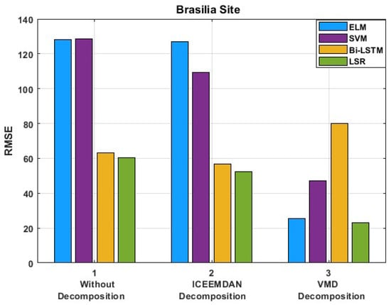 The framework was tested on real-world datasets from three locations with heterogeneous climatic conditions: Tamanrasset (Algeria), Brasilia, and Colorado (USA). The results show an error reduction of up to 30% compared to conventional models and a coefficient of determination () close to 0.999, demonstrating the effectiveness and reliability of the proposed method. Furthermore, the framework was evaluated in terms of computational complexity, showing that the VMD-based approach offers an optimal trade-off between accuracy and processing time (18–35 s for 10,000 samples), making it suitable for real-world applications and operational deployment. The flowchart of the forecasting strategy, depicted in Figure 1, provides a visual representation of the developed model and helps to understand the system’s overall functioning. Particularly, Figure 1 in the paper illustrates the overall flow of the developed model for forecasting solar radiation and wind speed. It visually represents the system architecture, starting from the transformation of data vectors into matrices and the creation of a test vector, denoted as Ytest, which is later used to generate the forecasts. Figure 1 outlines two scenarios in the preprocessing phase: the first, which is more comprehensive, involves the joint application of the ICEEMDAN and VMD decomposition techniques; the second, simpler scenario uses the Ytest vector directly without any decomposition. The section of Figure 1 depicting the flow with ICEEMDAN and VMD actually corresponds to the implementation of the one-stage decomposition, a distinctive feature of the proposed model compared to many existing multi-stage strategies. In this step, the original signal is divided into modal components through a single joint operation using both techniques, enhancing computational efficiency without sacrificing forecasting accuracy. Following the decomposition, although not explicitly represented in the figure, lies a crucial phase of the process: entropy-based selection. This step, which logically occurs immediately after the decomposition shown in the upper left part of the figure, serves to identify the informative subcomponents of the signal. The selected components are those exhibiting significant complexity according to the sample entropy measure, while redundant or noise-dominated components are discarded. This not only improves the quality of the reconstructed signal but also reduces the computational load, ensuring that only relevant information is passed on to the predictive models. In the diagram, this selection step would ideally be located between the decomposition block and the forecasting modules, but it is not visually depicted. Finally, the signals reconstructed from the selected informative components are processed by the predictive models shown in the central right section of Figure 1, namely Bi-LSTM, SVM, and ELM. The results produced by these models are ultimately combined through a least-squares regression-based strategy, represented as the final stage in the diagram, which yields the integrated forecast output. In conclusion, although Figure 1 provides a helpful overview of the entire process, it omits key elements such as the entropy-based selection and does not visually clarify the implementation of the one-stage decomposition—both of which are central to fully understanding the methodological innovations of the model.