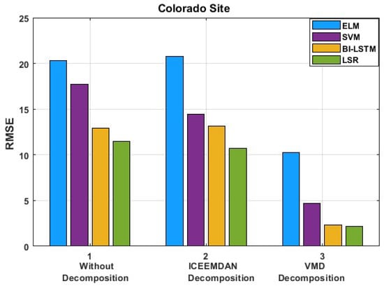 The proposed forecasting architecture distinguishes itself from conventional approaches through its integrated, single-stage design that combines signal decomposition, entropy-based component selection, and multi-model fusion. Unlike traditional methods that often rely on multi-step or layered decomposition strategies—each introducing additional complexity and error propagation—the present framework employs a unified decomposition step using VMD or ICEEMDAN. This choice ensures computational efficiency while preserving signal integrity. Furthermore, by incorporating sample entropy (SE) as a selection criterion, the model is able to systematically identify and retain only the most informative sub-signals, effectively reducing the influence of noise and redundancy without manual tuning. This pre-processing enhancement significantly improves the input quality for machine learning models, which are often sensitive to irrelevant features. In contrast to single-model predictors that may struggle to capture all dynamics of complex environmental data, our hybrid architecture leverages the complementary strengths of Bi-LSTM, ELM, and SVR. These models are combined through a least-squares regression (LSR) strategy, which assigns adaptive weights based on performance, resulting in more accurate and robust predictions. Compared to the existing literature, which typically isolates model training from signal preprocessing or relies on static model selection, the proposed framework introduces a dynamic, data-driven mechanism for both input refinement and model integration. This holistic design leads to a reduction in forecasting error (up to 30%) and high coefficients of determination (up to = 0.999), confirming its superior performance across multiple datasets and climate conditions.