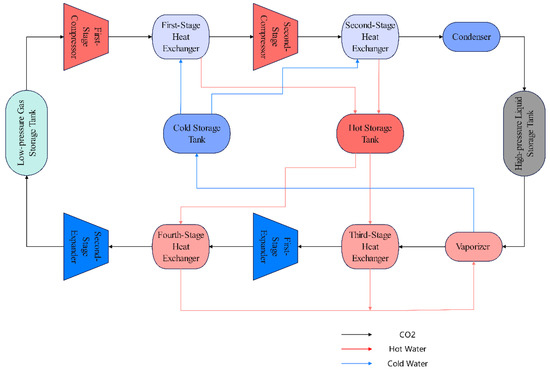 Figure 1 presents a schematic diagram of the LCES. The system mainly contains a compressor unit, a heat exchanger, a vaporizer, an expansion unit, a vaporizer, a low-pressure gas storage tank, a high-pressure liquid storage tank, a hot storage tank, and a cold storage tank. Through the thermodynamic cycle, the LCES achieves the storage and release of electric energy. In the energy storage stage, the grid power conditions necessary to drive the multi-stage compressor unit are as follows: low-pressure gaseous CO2 compressed into a high-temperature and high-pressure state; a gradient heat exchanger to recover the heat of the compression, which is stored in the hot storage tank, liquefied, and cooled to a high-pressure liquid form for storage; in the energy release stage, the liquid state of CO2 is re-tempered by the vaporizer into a high-pressure gas state, and the waste heat of expansion is used to raise the temperature of the work material, which is then expanded through a multi-stage expansion unit to generate electricity; the cold quantity released in the expansion process is recovered by the cold storage tank; and finally, the low-pressure CO2 gas is returned to the tank to complete the cycle.