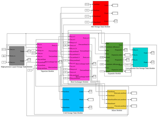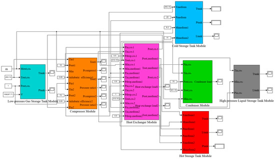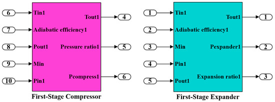 Through the mathematical model of each system component (Figure 2 shows the compressor and the expander module within the system), the dynamic simulation model of the energy storage and energy release system of the LCES is built in MATLAB/Simulink based on the topology and operation principle of the LCES, as shown in Figure 3 and Figure 4. The energy storage stage includes the energy storage low-pressure gas storage tank module, the compressor module (first-stage compressor and second-stage compressor), the energy storage heat exchanger module (first-stage heat exchanger and second-stage heat exchanger), the condenser module, the energy storage high-pressure liquid storage tank module, the energy storage cold storage module, and the energy storage hot storage module. The release stage includes the energy release high-pressure liquid tank module, the vaporizer module, the energy release heat exchanger module (third-stage heat exchanger and fourth-stage heat exchanger), the expander module (first-stage expander and second-stage expander), the energy release low-pressure gas storage tank module, energy release hot storage module, the energy release cold storage module, and the mixer module, the main role of which is to mix the residual-temperature water from the third-stage heat exchanger and fourth-stage heat exchanger outflow. This part of the heat can be used by the vaporizer to vaporize the liquid CO2 from the high-pressure liquid storage tank, which improves the overall energy utilization efficiency of the system. For this Simulink model, we have chosen auto for the solver and variable step for the time step [20].