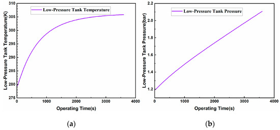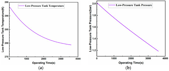 We set the heat exchange to medium as the high-pressure liquid water, hot storage tank, and high-pressure liquid storage tank are adiabatic; the cold storage tank and low-pressure gas storage tank exist; and in the heat exchange environment, after a period of time, the temperature inside the tank will gradually drop to the design temperature. The cold-storage-tank and low-pressure gaseous-tank energy storage and energy release stages are not carried out at the same time; after the operation of the energy storage stage, the cold storage tank, hot storage tank, low-pressure gas storage tank, and high-pressure liquid storage tank state data are synchronized to the energy release stage.
