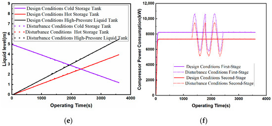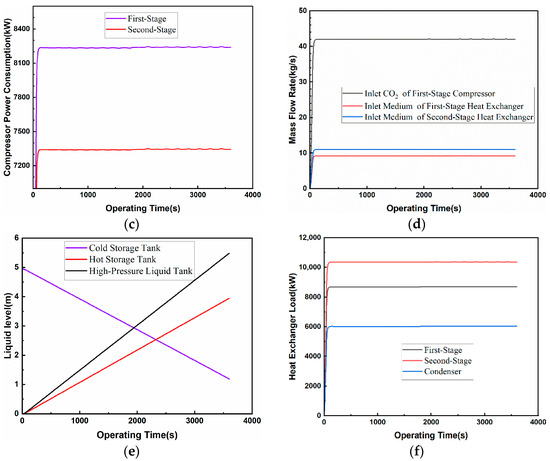 Simulation results of the energy storage stage for the design condition: (a) low-pressure gas storage tank temperature; (b) low-pressure gas storage tank pressure; (c) compressor power consumption; (d) inlet mass flow rate; (e) liquid level of storage tank; (f) heat exchange load.