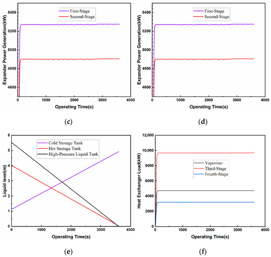 Simulation results of the energy release stage under design conditions: (a) low-pressure gas storage tank temperature; (b) low-pressure gas storage tank pressure; (c) expander power generation; (d) inlet mass flow rate; (e) liquid level of storage tank; (f) heat exchange load.