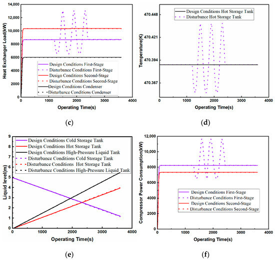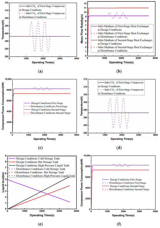 Effect of compressor inlet temperature perturbation on the system: (a) compressor inlet temperature; (b) medium inlet mass flow rate; (c) heat exchange load; (d) temperature of hot storage tank; (e) liquid level of storage tank; (f) compressor power consumption.