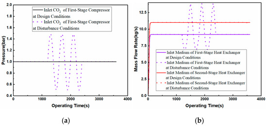 The effect of compressor inlet pressure perturbation on the system is shown in Figure 8. During the dynamic operation of the system, when the inlet pressure of the first-stage compressor varies in the interval of 0.5 bar to 1.5 bar during 1200~2400 s, the pressure ratio of the first-stage compressor changes from a fixed value of 10 to a variable value in the interval of 6.67~20 because the outlet pressure of the first-stage compressor is kept constant, resulting in the power consumption of the first-stage compressor changing in the range of 6481.83 kW to 11,679.55 kW. The outlet temperature of the first-stage compressor varies from 474.85 K to 623.49 K, and the trend is the opposite to that of the inlet pressure of the first-stage compressor. Due to the change in CO2 temperature at the inlet of the first-stage heat exchanger, the mass flow rate of the medium 1 at the outlet of the cold storage tank also changes synchronously in the range of 6.91~13.88 kg/s, and the trend of change is the opposite to that of the inlet pressure of the first-stage compressor so as to maintain the outlet temperature of the medium of the first-stage heat exchanger in the range of 470.65 K, which ensures that there is sufficient heat to heat CO2 at the energy release stage. At the same time, the inlet temperature of the second-stage compressor is exchanged for design working conditions value, so the power consumption of the second-stage compressor and the mass flow rate of the second-stage heat exchanger inlet medium remain unchanged.