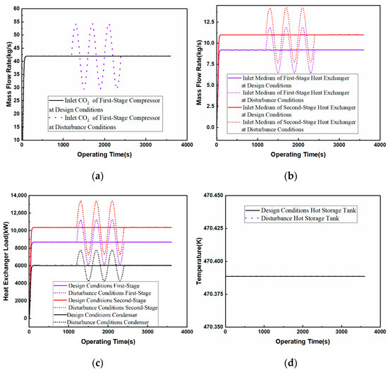 The effect of compressor inlet temperature perturbation on the system is shown in Figure 7. During the dynamic operation of the system, when the inlet temperature of the first-stage compressor is perturbed in the range of 283.15~303.15 K within 1200~2400 s, the outlet temperature of the first-stage compressor is gradually synchronized with the change, resulting in a cycle change in the first-stage compressor power dissipation of 7977.49~8484.47 kW, which is equivalent to 96.84~102.99% under design working conditions. As the CO2 temperature at the inlet of the first-stage heat exchanger changes synchronously from 510.39 K to 539.2 K, the mass flow rate of the medium at the outlet of the cold storage tank rises from 9.2 kg/s at the design condition to the maximum of 9.86 kg/s, which cause the outlet temperature of the medium at the first-stage heat exchanger to be maintained at 470.65 K so as to ensure that there is sufficient heat to heat CO2 at the energy releasing stage. At the same time, the inlet temperature of the second-stage compressor is exchanged to 313.15 K at the design condition such that the power consumption of the second-stage compressor and the mass flow rate of the medium in and out of the second-stage heat exchanger remain unchanged.