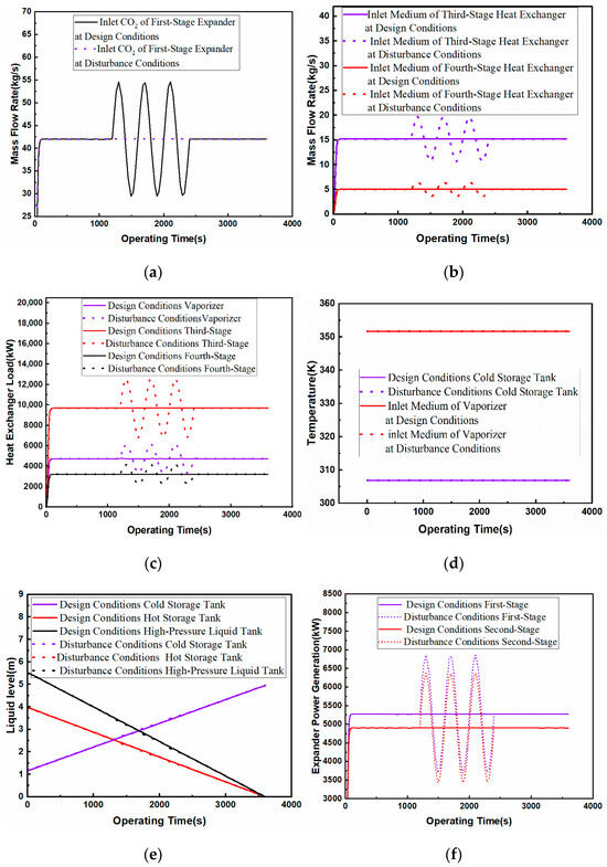 Effect of compressor inlet mass flow perturbation on the system: (a) compressor inlet mass flow rate; (b) medium inlet mass flow rate; (c) heat exchange load; (d) temperature of hot storage tank; (e) liquid level of storage tank; (f) compressor power consumption.