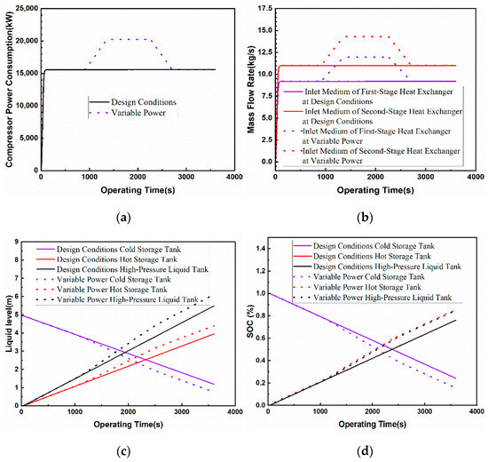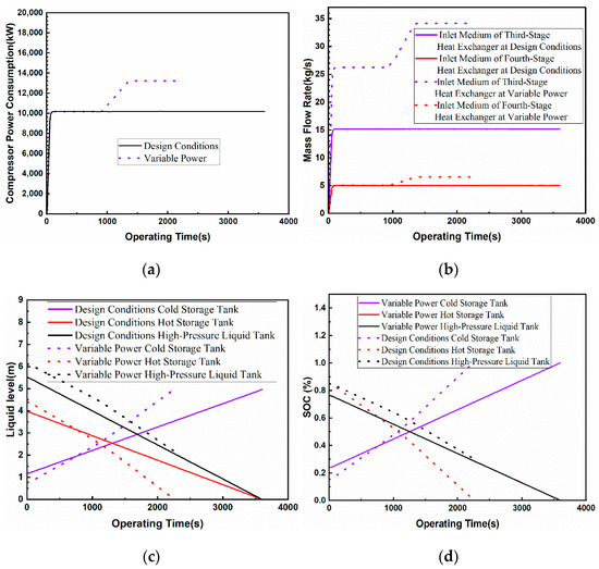 The results of the tank level change are shown in Figure 11. When the total compressor power is running at the set power, in order to maintain a carbon dioxide temperature of 313.15 K at the outlet of the first-stage and second-stage heat exchangers, the mass flow rate of the inlet medium of the first-stage heat exchanger gradually rises and stabilizes at 9.2 kg/s and then rises to 11.89 kg/s with the increase in compressor power, gradually decreasing and stabilizing at 9.2 kg/s. The mass flow rate of the inlet medium of the second-stage heat exchanger gradually rises and stabilizes at 11 kg/s and then rises to 14.22 kg/s with the increase in compressor power, gradually decreasing and stabilizing at 11 kg/s. The mass flow rate of the second-stage heat exchanger medium inlet gradually rises and stabilizes at 11 kg/s then rises to 14.22 kg/s with the increase in compressor power, gradually decreasing and stabilizing at 11 kg/s. With the inlet of the heat exchanger medium, the liquid level in the liquid storage tank gradually decreases, and the total mass of the outlet of the liquid storage tank under variable power conditions is larger than that under design conditions in an hour; thus, the system completes the operation of the variable power condition. The liquid level in the storage tank decreases to 0.76 m, which is 36% lower than the 1.19 m observes under design conditions. At the same time, due to the existence of positive and negative climbing stages in the compressor power under the variable power condition, the decrease rate of the corresponding liquid level in the storage tank is larger and then smaller compared with that under design conditions. Similarly, at the end of the system operation, the liquid level in the hot storage tank under variable power conditions rises to 4.39 m, which is 11.1% higher than that under design conditions (3.95 m), and the corresponding increase rate of the liquid level in the hot storage tank is larger and then smaller than that under design conditions. As the total power consumption of the compressor under variable power conditions is greater than the design condition over 1 h of system operation, the level of the high-pressure liquid storage tank under variable power conditions rises to 6.11 m after the system operation, which is 11.5% higher than that under design conditions (5.48 m), and the corresponding rate of elevation of the high-pressure liquid storage tank level is larger and then smaller compared with that under design conditions. The change in the SOC value of each liquid level is similar to the change in liquid level in the storage tank, and the SOC value of the cold storage tank under the variable power condition decreases from 100% to 15.89%, which is 34% lower than that obtained under design conditions (24.06%). Because the system is working under the same operating conditions, the hot storage tank and high-pressure liquid storage tank of the level SOC value change the synchronization from 0 to 84.89%.
