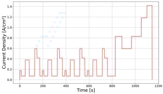 In order to diagnose the HI of a PEMFC, a dataset is required. The dataset used in this paper came from Zuo et al. []. The study analyzes the durability and long-term dynamic performance of a Proton-Exchange-Membrane fuel cell (PEMFC), with an active surface area of 25 cm², subjected to dynamic load profiles, according to an FC-DLC cycle. The tests, carried out at the Greenlight G20 test station, involved 3076 cycles over approximately 1008 h. The operating conditions included a cell temperature of 70 °C, with the hydrogen dew point set at 55 °C and the air dew point at 65 °C. The hydrogen and air inlet pressure was maintained at 110 kPa, while the cell operating humidity was controlled by humidifiers. Data acquisition was carried out at 1 Hz, recording parameters such as voltage, current, power, inlet and outlet pressures, gas flow rates and operating temperatures. This cycle is shown in Figure 1 and was repeated 3076 times. In addition, regular characterizations (polarization curves) were carried out every 100 h to provide information on PEMFC performance, aging and performance recovery phenomena. Given that actual PEMFC systems generally operate under dynamic currents, the choice was made to use this dataset for HI estimation and RUL prediction. The results obtained in this article provide a basis for validating the methodology, which will be validated on other datasets in future work.