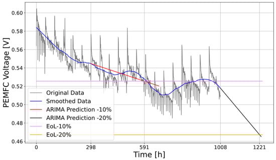 After the data were processed, the ARIMA model was used to predict the PEMFC voltage in order to estimate its overall RUL. The data used for prediction were the same as in the previous section. Table 3 and Figure 4 show the tuning parameters and results obtained with this approach, respectively. In Figure 4, an increase in voltage is observed after 700 h. The loss in voltage is due to the degradation of the PEMFC; however, voltage recoveries can occur for a number of reasons, such as a performance recovery procedure, a characterization phase such as a polarization curve before cycling the system again, or improved membrane hydration. The authors of the dataset indicate that the characterization phases have contributed to deepening PEMFC performance recovery phenomena. However, this information alone does not really explain the voltage increase observed after 700 h. Other factors must have influenced this, such as better management of membrane hydration. It is for this reason in particular that the Savitzky–Golay filter was used, in order to recover the overall degradation trend, and not local performance recovery phenomena due to various factors. It should be pointed out that two predictions were made using the ARIMA model to suit all applications, the first to estimate the RUL when the PEMFC has lost 10% of its original power, the second for when it has lost 20%. The prediction starting point may slightly affect the prediction accuracy if the data are not well filtered beforehand. Nevertheless, in order to suit an industrial and commercial context, we chose to define the starting point arbitrarily between 200 h and 300 h before the EoL of 10% and 20%, respectively, with the aim being to validate the RUL estimate with a prediction horizon of at least 200 h, enabling maintenance interventions to be anticipated. On the other hand, it should be noted that the prediction starting point for unfiltered data would have a strong impact on the results of the ARIMA model, notably due to non-linear variations. As far as the learning window is concerned, all data preceding the prediction were used for model tuning.