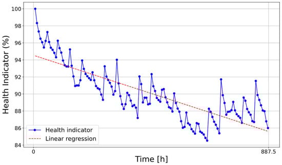 It should be pointed out that the data did not reach a loss of 20% HI; nevertheless, a future prediction was made in order to estimate the operating time at which the system will have undergone a 20% HI loss. The prediction results were very good for the 10% HI loss, with an error of less than 1% for a prediction horizon of 372 h. In addition, the computation times for the predictions were 3.8 s and 9.2 s, respectively, enabling the predictions to be rerun to ensure their quality. Furthermore, this fast computation time makes it possible to carry out online retraining. This approach is an integral part of predictive maintenance (PrM) and is compatible with actual systems, as it has the following advantages: