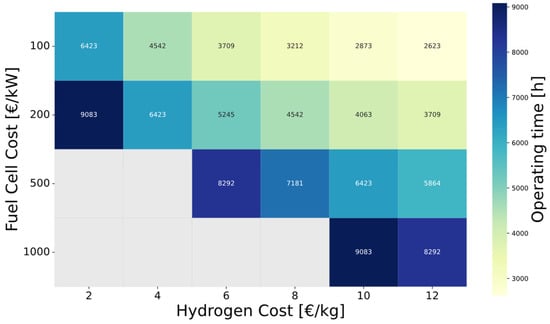 The PEMFC maintenance scheduling optimization calculation was carried out considering several possible scenarios (current and future) for the price of hydrogen and PEMFCs, with variations of 2 EUR/kg, 4 EUR/kg, 6 EUR/kg, 8 EUR/kg, 10 EUR/kg and 12 EUR/kg and of 100 EUR/kW, 200 EUR/kW, 500 EUR/kW and 1000 EUR/kW, respectively. The assumptions for the calculations are as follows: