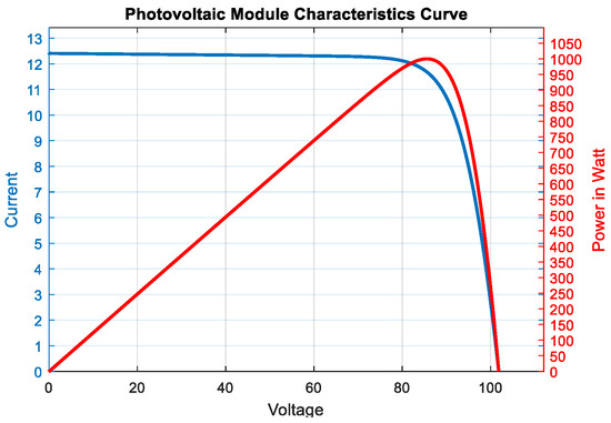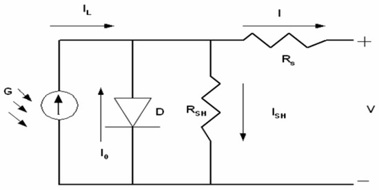 where I represents the PV current, which is directly affected by the intensity of the sun and temperature fluctuations. The saturation current I0 is influenced by temperature variations, α denotes the diode’s ideality factor, and q (−1.6021764 × 10−19) signifies the charge of one electron. K (−1.380653 × 10−23) denotes Boltzmann’s constant, T (K) represents the absolute temperature of the p-n junction, and RS and RSH signify the series and shunt (parallel) equivalent resistances of the solar panel, respectively [4].
