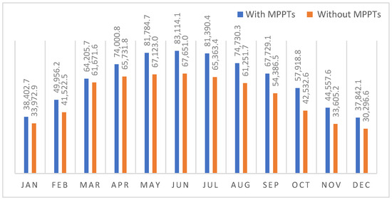 Monthly Power Production (with MPPTs) > Monthly Power Production (without MPPTs).