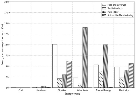 The 2022 energy usage across major manufacturing industries in South Korea is shown in Figure 1. In the food and beverage sector, energy consumption is primarily classified as city gas, thermal energy, electricity, and other fuels. The FEMS continuously monitors and controls a factory’s energy consumption, highlighting its role in promoting energy efficiency. For example, if the FEMS detects that a piece of equipment in the food factory is consuming excessive energy due to suboptimal operation during off-peak production hours, it can alert operators to adjust the system’s settings or reduce power inputs, thereby improving overall efficiency. The South Korean government has mandated the adoption of FEMSs for energy-intensive enterprises consuming over 10 million TOE, starting in 2025. For small and medium-sized enterprises consuming less than 10 million TOE, the government aims to expand the support for the dissemination of FEMSs in conjunction with smart factories, with a target of supporting more than 3000 new installations by 2040 [2].