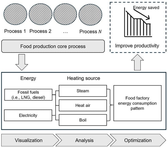 Energy consumption has become a significant global concern, leading to increased interest in reducing energy consumption and greenhouse gas emissions across various sectors. According to the 2022 domestic energy consumption statistics released by Korea’s Ministry of Trade, Industry, and Energy [1], the industrial sector consumes a total of 133,804,000 tons of oil equivalent (TOE). In addition, the food and beverage industry accounted for 2,558,000 TOE. Although the energy consumption of the food and beverage industry appears relatively small within the broader manufacturing sector, there is a growing demand for energy management systems that enhance energy efficiency, reduce costs, and minimize environmental impacts in this energy-intensive field. Consequently, initiatives to lower energy consumption and improve energy efficiency in the food industry are necessary. The analysis of energy usage in food factories indicates that their thermal energy consumption is substantial, comprising 59% for heating, 16% for cooling, 12% for mechanization, 8% for infrastructure, and 5% for other purposes. However, current energy management practices in food manufacturing plants are largely manual and lack the systems to systematically analyze or optimize energy consumption patterns for individual processes. Typically, equipment operators in food factories regulate energy by adjusting the temperature, pressure, and heating time based on empirical knowledge, making it difficult to maintain a consistent quality and achieve efficient energy operations.