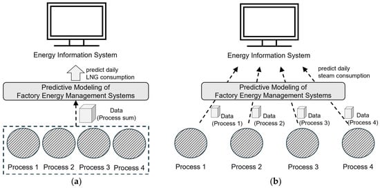 A previous study [19] predicted LNG consumption using MLP and SVR. Nevertheless, pattern changes after the application of a FEMS necessitated model retraining with recent data, as depicted in Figure 4. Furthermore, while a model was developed to forecast total LNG consumption for the food factory, no studies have addressed predicting steam energy consumption alongside LNG in individual processes. Therefore, changes in steam energy consumption patterns must also be considered, as shown in Figure 4b. After applying customized predictive models to each process, the predicted information should be provided to the energy information system (EIS) for a more detailed analysis of energy consumption patterns, as presented in Figure 3b.