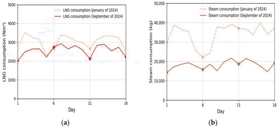Energy consumption patterns over a fixed period in a food factory based on a FEMS: (a) current status of LNG consumption patterns; (b) current status of steam consumption patterns.
