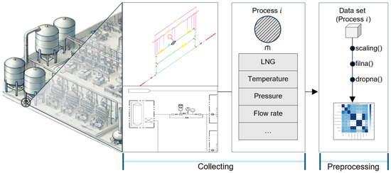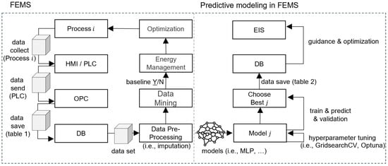 As illustrated in Figure 5, in a food factory employing a FEMS, data are collected at predetermined intervals throughout the food production process using Human–Machine Interface (HMI) systems and Programmable Logic Controller (PLC) equipment. Specifically, the data gathered by the PLC are stored in a database via server–client communication using the Open Platform Communications (OPC) protocol. These stored data are then preprocessed and utilized to identify energy consumption patterns and monitor energy usage, thereby establishing a baseline for the food production process. Once this baseline is established, energy consumption shifts from manual to automatic control, enabling the optimization of energy use based on the baseline. Additionally, the conventional FEMS in the food factory employs predictive models to forecast total LNG and electricity consumption. However, since each process has distinct characteristics, their energy consumption patterns vary, necessitating more detailed predictive modeling. Therefore, this study proposes a customized predictive model for each individual process within the food production system.
