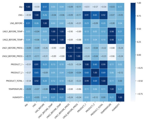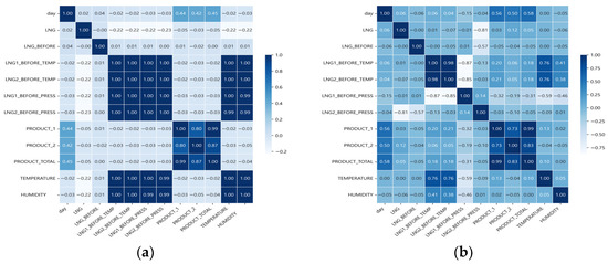 In the full-period data, preprocessing enhanced the correlation between LNG and the key variables. Specifically, the correlation between LNG and day changed from −0.59 in the three-month data to 0.06 for the entire period, reflecting seasonal changes and operational adjustments. Preprocessing reduces variable redundancy and clarifies correlations, thereby providing valuable data for prediction models. However, due to alterations in consumption patterns from energy-saving measures, the LNG consumption prediction model requires improved and customized steam energy prediction models to be developed for each process.