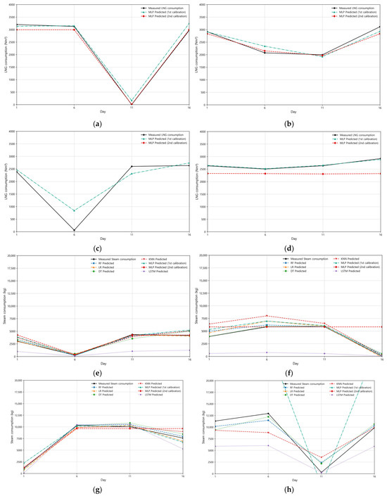 Comparison of predicted and actual values of prediction models: (a) LNG consumption (90 rows); (b) LNG consumption (91 rows); (c) LNG consumption (624 rows); (d) LNG consumption (excluding weekends, 442 rows); (e) customized model (1st process); (f) customized model (2nd process); (g) customized model (3rd process); (h) customized model (4th process).