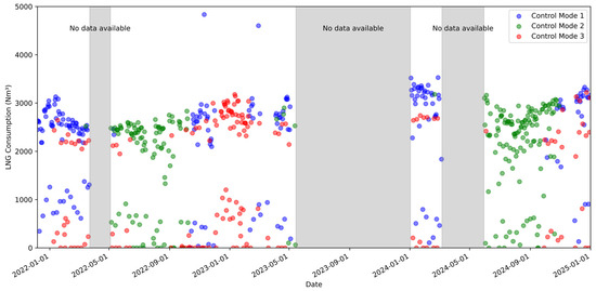 Previously, MLP and SVR models were used to predict LNG energy consumption for an entire food factory [19], as shown in Figure 3a. The model’s performance was evaluated based on CVRMSE and R2 following the guidelines in ASHRAE [20] and Webster and Bradford [21]. In addition, prediction accuracy was assessed by calculating the mean error rate of the predicted values in ASHRAE, and lastly the benchmark CVRMSE was set below 15% for monthly data and below 30% for hourly data. Our study utilized daily process data, establishing a CVRMSE under 20% and an R2 above 0.75. However, after implementing a FEMS and establishing the baseline, energy consumption patterns shifted due to the transition from manual to automated control, as shown in Figure 4.