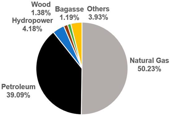According to the Bolivian Energy Balance Report [49], published in 2023, biomass-based energy production accounts for 7.18%, while fossil fuels remain the dominant energy source in the country. Figure 3 illustrates this distribution.