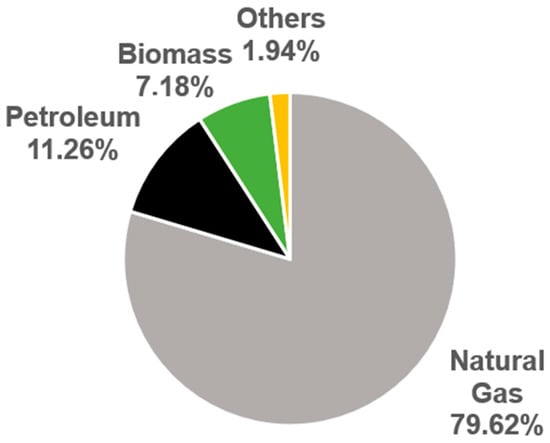Argentina has a strong agricultural and agro-industrial sector and is a major producer of grains, meat, dairy products, and other commodities. This gives the country significant potential for biogas production from agricultural and industrial waste, which can be used for thermal and electrical energy generation or upgraded to biomethane. Argentina’s energy matrix is heavily reliant on fossil fuels (89.3%), while renewable sources account for only 10.7% [37], as shown in Figure 2.