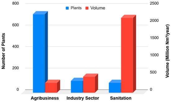 In 2016, the National Institute of Industrial Technology conducted a study identifying 105 biodigestion plants of varying sizes and technological levels across the country [38]. Of these, 62 were classified as medium- and large-scale facilities, with 53.1% operated by the private sector and 37.5% by the public sector. The main feedstocks for these plants include industrial waste (38.0%), urban waste (28.0%), and livestock waste (27.0%). Among the 62 highlighted plants, 44.3% of the biogas produced was used for thermal applications, while only 12.0% was used for electricity generation.