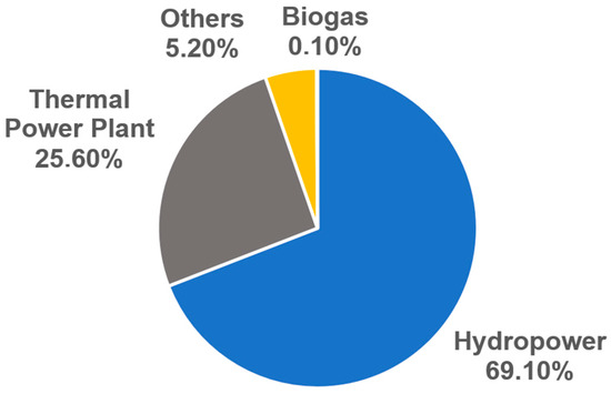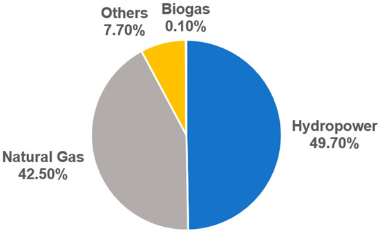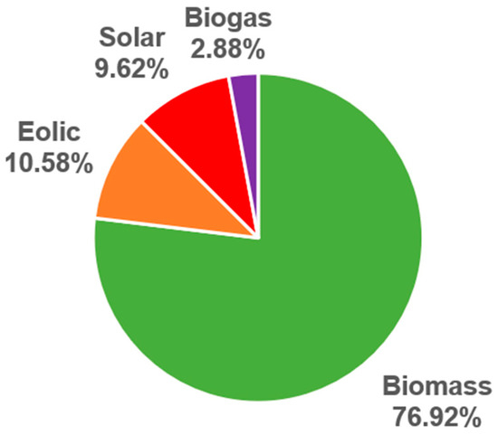 Ecuador’s 2024 energy balance [86] reported a 14.0% decrease in biomass energy production compared to 2021. Regarding electricity generation, biogas accounts for only 0.1% of the total, as shown in Figure 8. The latest energy balance [86] also indicates that a significant share of Ecuador’s electricity matrix relies on fossil sources, particularly natural gas.