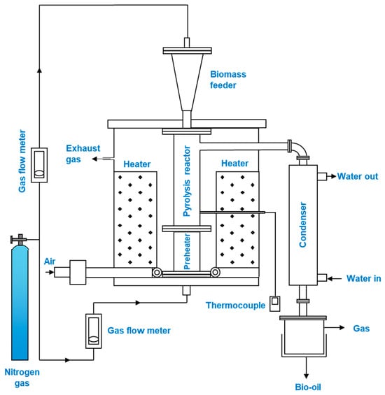 An entrained flow reactor, or a drop tube reactor, moves feedstock through a tube using the force of gravity [84]. Figure 3 illustrates the schematics of a typical entrained flow reactor used for pyrolysis. The reactor utilizes finely pulverized feedstock, which is fed into a high-temperature reactor where it is rapidly heated in an inert atmosphere to prevent oxidation. The reactor’s architecture allows for a constant influx of feed material and gases, facilitating uniform and efficient thermal processing with brief residence times, typically ranging from seconds to a few minutes. This leads to the efficient transformation of solid substances into gaseous and liquid products, which can then be gathered and processed.